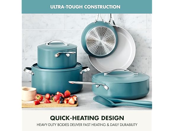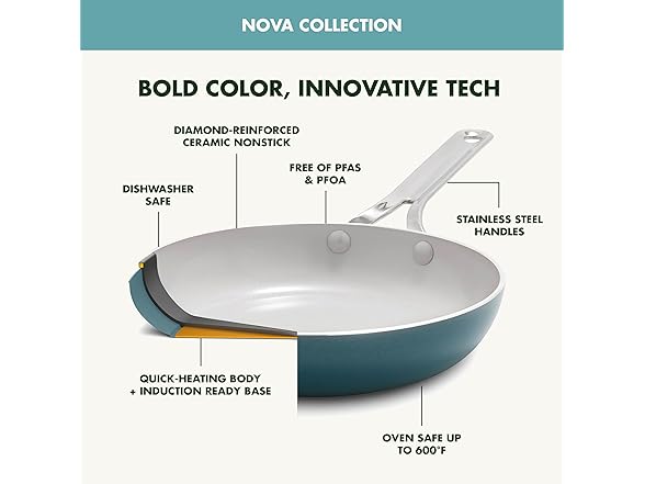 Featured in Oprah's Favorite Things 2024. Finished in bold hues that elevate every space, this 10-Piece Cookware Set from GreenPan Nova includes all you need to cook with confidence. Our Thermolon healthy ceramic nonstick coating features diamond-enhanced layers is free of PFAS, PFOA, lead & cadmium. The heavy-gauge aluminum bodies are built for daily durability and deliver excellent heat conduction. Take these pans anywhere thanks to the specially designed induction base suitable for all stovetops, including induction. The forged aluminum lids add even more strength on top and feature a small divot that doubles as a utensil rest, minimizes contact. For ultra-convenience this collection is dishwasher safe so you can spend less time cleaning and more time eating.