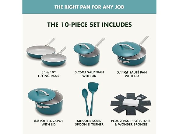 - COOKWARE SET INCLUDES: 3.26QT Saucepan with Lid, 6.61QT Stockpot with Lid, 8” Frypan, 10” Frypan, 5.11QT Sauté Pan, Silicone Solid Spoon, Silicone Turner, 2x Pan Protectors, Wonder Sponge
