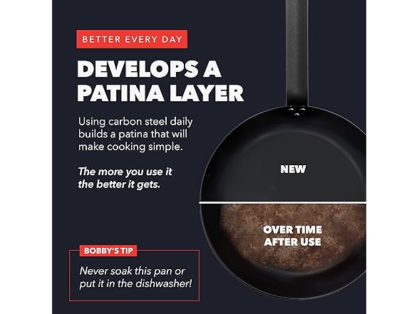 Created in partnership with Bobby Flay, this PFAS-free carbon steel collection brings professional-grade cooking right to any kitchen. Built for everyday durability, these pre-seasoned pans develop a natural nonstick patina that gets better with every use. Oven safe up to 660˚F, this collection is designed to handle high-heat cooking with ease. The heavy-duty carbon steel construction allows for rapid heating, making it ideal for any task: searing, browning, and high-heat cooking on the stovetop, in the oven, or over an open flame. For care, simply hand wash using hot running water and a sponge or scrub brush to maintain its quality.