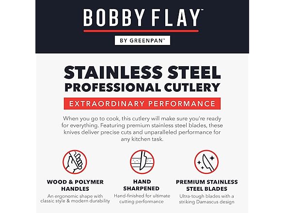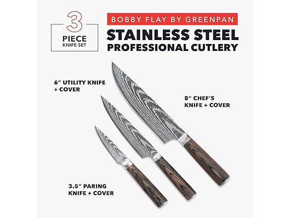 World-renowned chef, TV host, restaurateur, and author Bobby Flay has partnered with GreenPan to bring years of expertise and cooking innovation to this cutlery collection. The premium stainless steel blades have a flowing Damascus design and the hand-finished wood and polymer handles deliver standout looks and performance in any kitchen. Bobby Flay and GreenPan thought of everything. Each knife is hand-finished for years of ultimate cutting performance. Plus, the comfort grip ensures you have total control over your cuts so you can prep with confidence. Lightweight and balanced, these knives are specially designed for daily use. The entire set stores easily with sheaths to protect them in the drawer and keep them sharp longer. This cutlery set includes: 3.5” paring knife with sheath, 6” utility knife with sheath, and 8” chef’s knife with sheath.