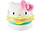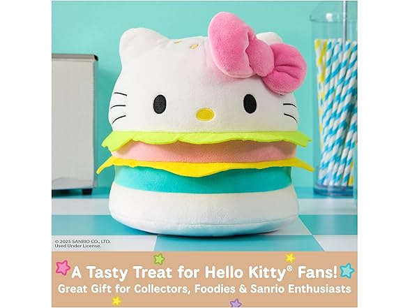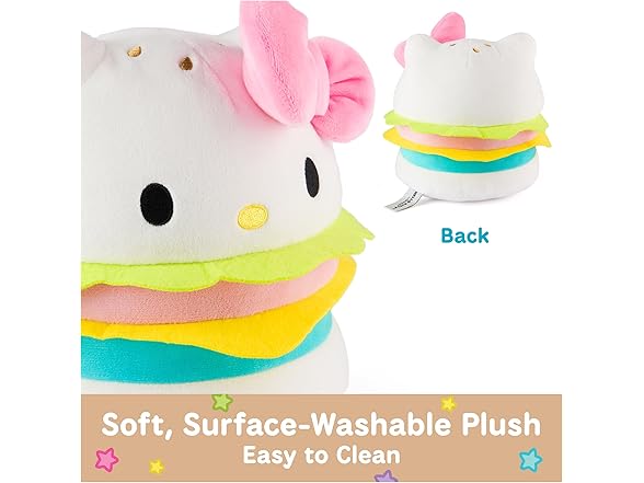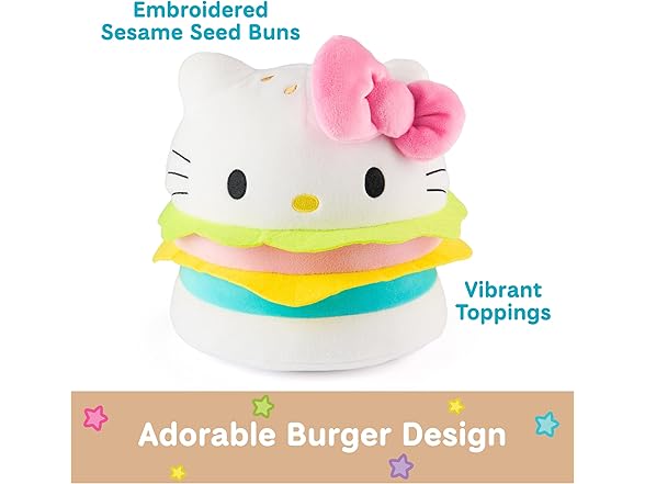 - HELLO KITTY HAMBURGER PLUSH: This soft 8” plush features Hello Kitty as a tasty hamburger She has neon pink and blue patties with bright green and yellow felt toppings, sandwiched between two soft white buns embroidered with golden sesame seeds
