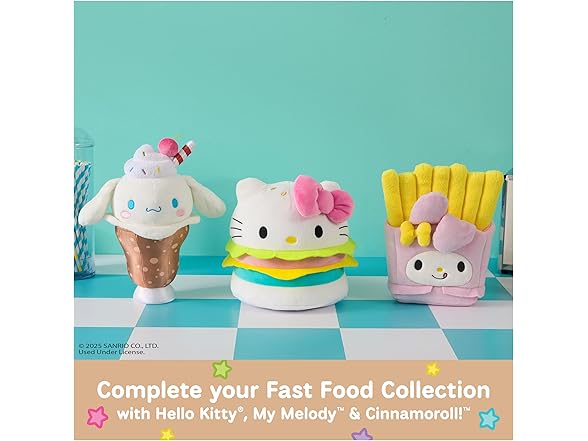 From backyard cookouts to late-night cravings, Helly Kitty and Friends are here to tempt you with snuggles! Hello Kitty, My Melody, and Cinnamoroll are stealing the show as crave-worthy fast-food snacks in the latest food-themed Sanrio plush collection by GUND. This large, huggable 8-inch plush features Hello Kitty in delicious hamburger form with fun, colorful ingredients that pop! Hello Kitty has bright pink and blue “patties” with neon green and yellow felt “lettuce” and “cheese” pieces. Its unique, vibrant design makes this soft plush an eye-catching piece for any kawaii plushie collector. My Melody French Fries and Cinnamoroll Root Beer Float plush are also available - collect all three for a complete and balanced plush meal! Each GUND Hello Kitty and Friends fast food plush is appropriate for ages 1 and up. Surface-washable; ships in a protective poly bag.