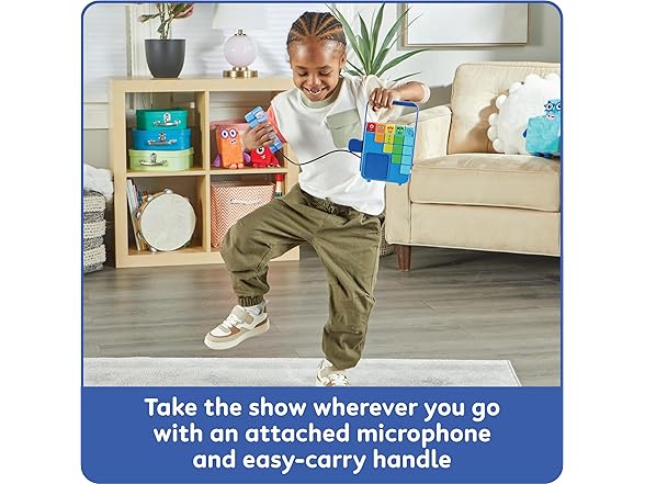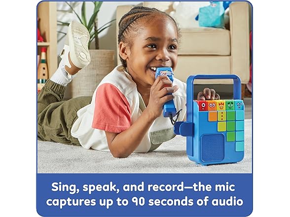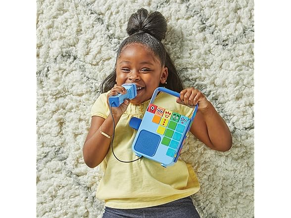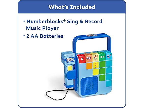Sing and count along with your favorite Numberblocks! Put on a musical, math-tastic show with your favorite Numberblocks™ friends using the Numberblocks Sing and Record Music Player! Features 15 lively Numberblocks sounds and songs, including the Numberblocks theme song. Children can simply press the buttons to count and enjoy a musical mix of numbery songs and phrases. Adjust the volume to entertain a crowd, or use the headphone jack for a private concert. The player is portable with an attached microphone and easy-carry handle—take the show wherever you go! They will delight in imaginative play as they amplify and record their voices with the built-in microphone—and use the playback feature to enjoy the math melodies they create. Record and replay up to 90 seconds of audio. Includes 1 Music Player with Attached Microphone and 2 AA Batteries. As your little one works from preschool to kindergarten, the Numberblocks Sing and Record Boom Box is a great way to make learning fun and help with the transition. The Numberblocks crew brings math learning to life with the Numberblocks Sing and Record Boom Box! Numberblocks is helping millions of children around the world to fall in love with numbers, master key math skills, and discover the joy of learning.