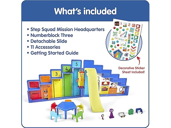 - TODDLER NUMBER LEARNING TOYS: Includes the Step Squad Headquarters Playset, Numberblock Three figure, detachable slide, 11 spy-themed accessories, and stickers so kids can customize their headquarters for endless adventures.
