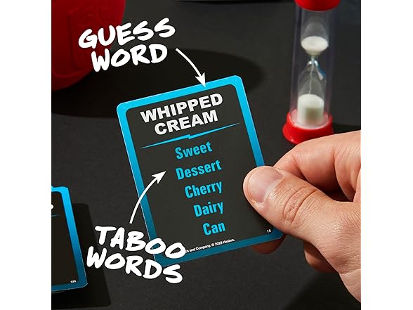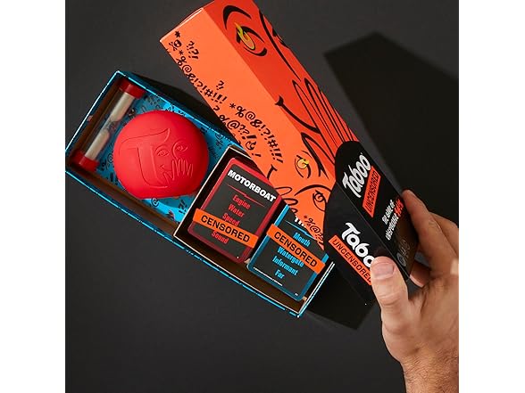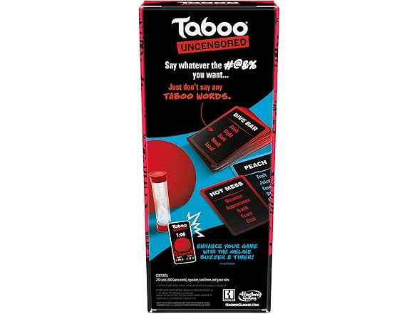 The game of unspeakable fun got a lot more … unspeakable. It's the adults-only version of the Taboo game! In the Taboo Uncensored game, get your team to say the Guess word without saying any of the forbidden words. (Most too forbidden to even appear on this screen.) Can you get teammates to say "Eggplant" without being able to say "Purple," "Vegetable," "Parmesan," "Emoji," or "Shape"? This fun party game features 240 cards with 480 Guess words from pop culture, trends, and bathroom stall walls probably. Players try to give carefully worded clues to help team members guess words fast as they race against the timer. Just don't mention unmentionables, or it's time for the squeaker and you lose that point. Looking for funny party games for adults or group games for game night? This saucy party board game is a hysterical game for game nights, bachelorette parties, and more, and it makes one of the best game night games for groups. For ages 17+. Taboo is a trademark of Hersch and Company, Los Angeles, CA. Hasbro and all related terms are trademarks of Hasbro.