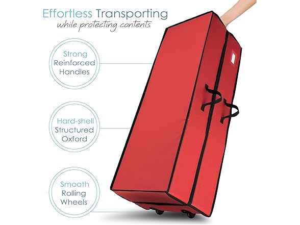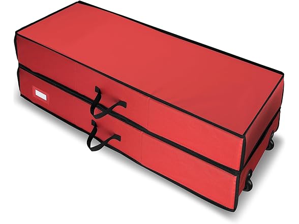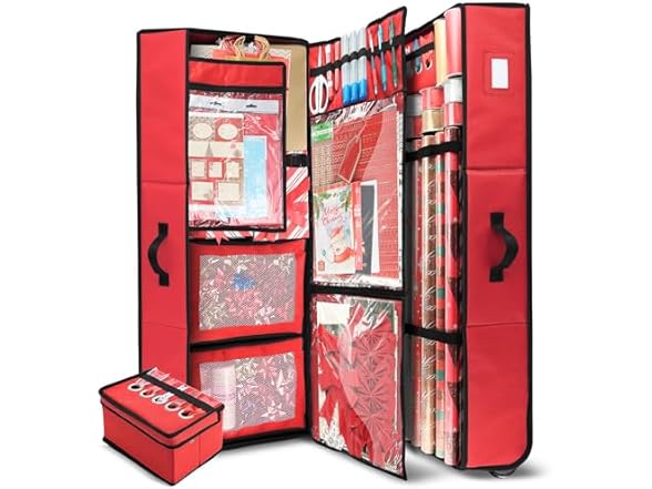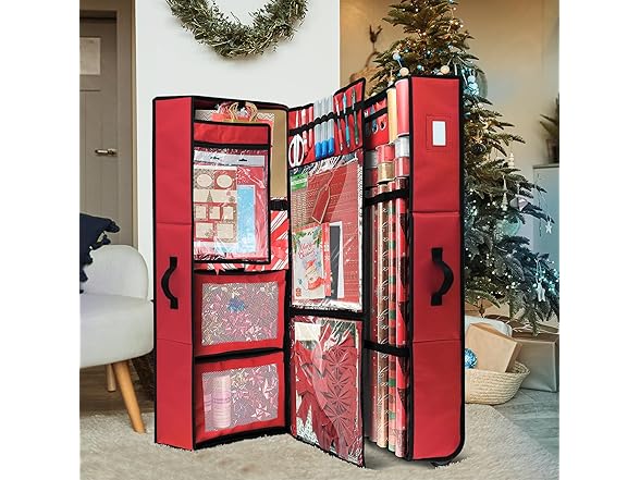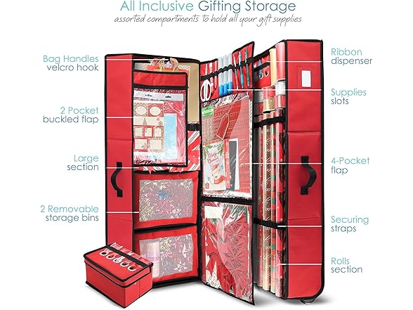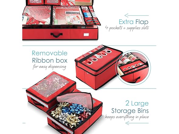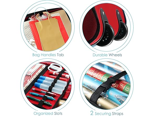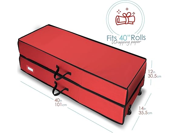 Hearth & Harbor Wrapping Paper Storage Container with Ribbon Dispenser and Interior Pockets - Large Christmas Storage Containers with Wheels, Fits 30 Rolls of 40" Length, Red