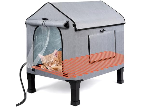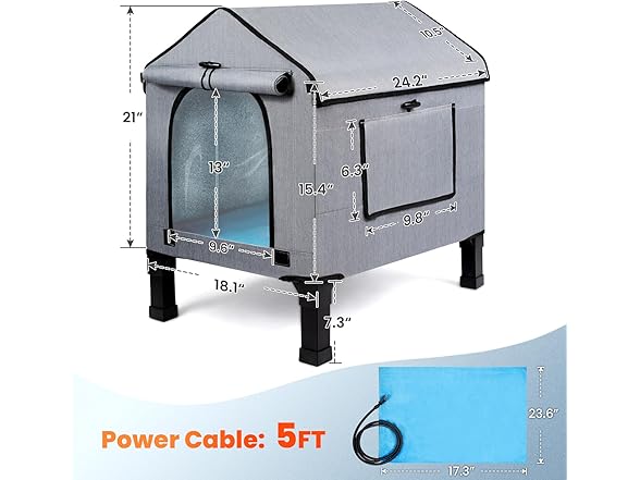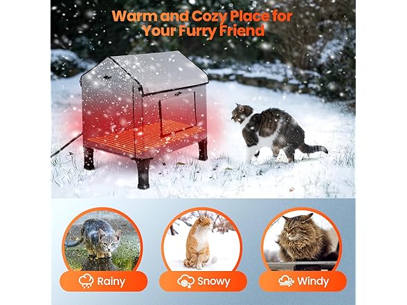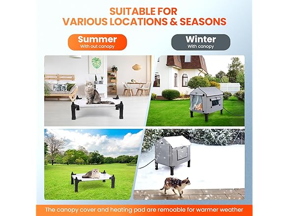 - Suitable for All Year Round: removable heating pads make the inside of the cat house warm in winter. The side mesh window allows for ventilation during hot summer days and can be closed during winter or rainy seasons.