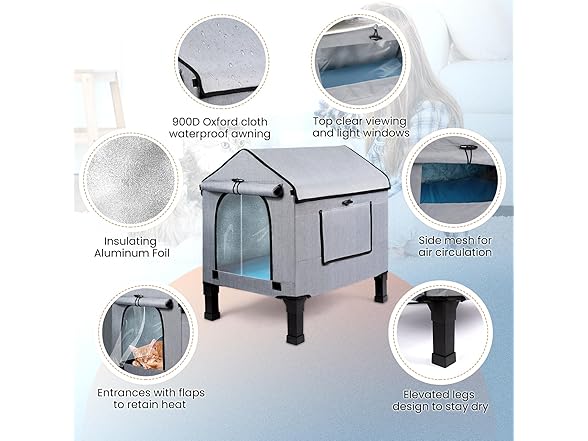 - Dry and Ventilated Design: the raised floor mat to keep it off the wet ground, ensuring proper airflow and dryness, there's no more worrying about snow and moisture on the ground or being submerged in water, perfect for outdoor cats.