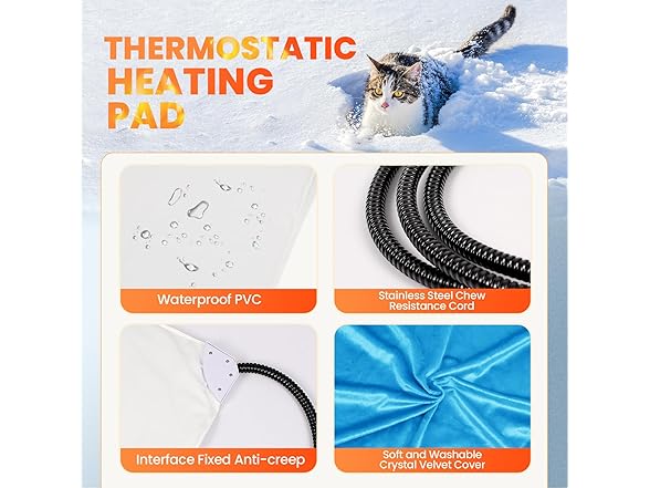 - Waterproof and Safe Heating Pad: The inside of the pad is made of flame-retardant waterproof material. Hard Extra stainless steel case on the power cord prevents pets from biting the wires. The super soft cover is removable and machine washable.