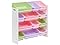The perfect organizer for children's playrooms or bedrooms, these colorful bins make organizing fun and easy, even for small kids. Effortlessly sort matchbox cars, tinker toys, action figures, craft supplies and more into the sturdy plastic bins. The natural wood frame holds 12 containers of varying sizes to keep everything tidy. Each bin measures 5 inches high, providing ample storage space for both small and medium size toys, books, clothing, and more. Bins are removable from the shelves making clean-up time fast and simple. Although perfect for kids toy storage, this handy 12-bin organizer has many other uses. Just use your imagination. Includes safety mount hardware to secure unit to wall and help avoid tipping.
