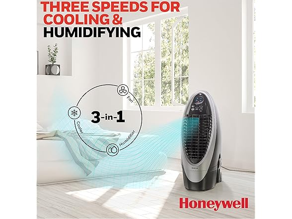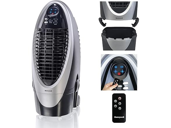 The Honeywell 300 CFM indoor evaporative air cooler offers an energy efficient cooling option when the air is hot with low humidity, such as desert areas like the southwestern United States (recommended humidity level is 60% or less for maximum efficiency). Honeywell evaporative air coolers do not require power hungry components like compressors. The low power consumption (only 102 watts) translates into significant savings on energy bills compared to using air conditioners. Just unpack, add water/ice, place near open door or window, plug it in, and use. This unit is ideal for indoor use in open environments with adequate cross ventilation up to 175 square feet. Four fan speeds and oscillating louvers evenly distribute cool air through the honeycomb cooling media while the carbon dust filter cleanses the air. Angled LED display and control panel allows for easy viewing while the included remote control allows you to change the settings from across the room. For those living in more humid climates, consider portable air conditioning units or window air conditioners.