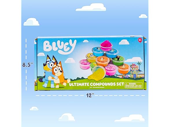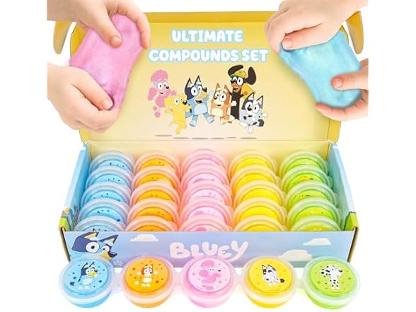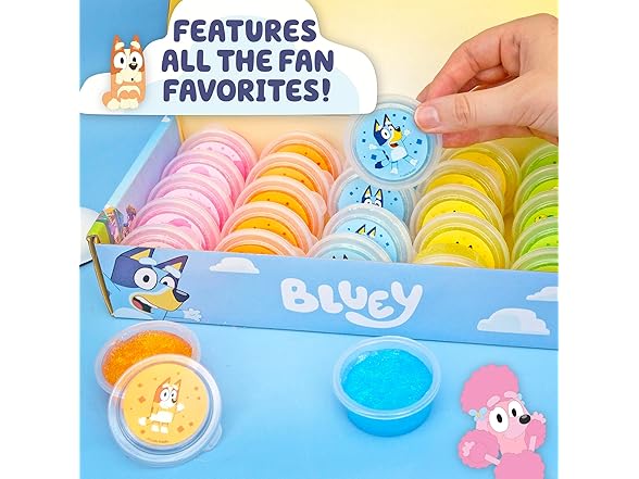 Get ready for glittery, scented fun with the Bluey Ultimate Compounds Set! This colorful collection includes 25 ready-made glitter slimes inspired by your favorite Bluey characters. Each resealable jar is packed with stretchy, squishy slime in sweet scents and playful colors — like blue raspberry, pink bubblegum, yellow lemon and more! Skip the slime activator, mixing, and measuring — just open the lid and start squishing! The best part? Every glittery slime comes in a resealable container with stickers of Bluey, Bingo, Coco, and the more on top, so you can store and enjoy them any time. Whether you need party favors for a Bluey birthday party or want to add a dash of fun to sensory bins, playdates, or staycation activities, this all-in-one set brings the world of Bluey straight to your hands…for real life! Perfect for ages 6 and up.