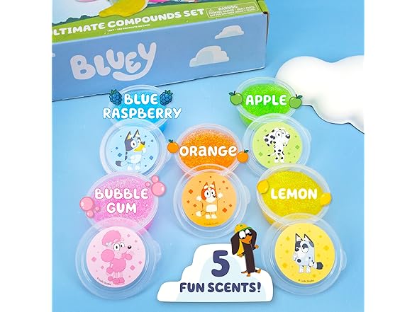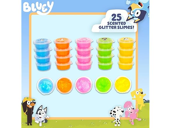 - 25 SCENTED GLITTER SLIMES: Every sparkly slime has a fun scent that matches your favorite Bluey characters, like Bingo’s orange slime, Coco’s pink bubble gum, Muffin’s yellow lemon, and more!