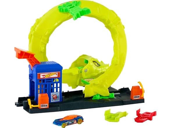 Race and stunt through the Hot Wheels Snake Spiral Attack Playset that features a massive snake nemesis and two ways to play! Drive onto the set and refuel at the gas pumps that have adjustable hoses, then head into the mini-mart that's also a covert launcher. Slam the launcher with enough power to send cars speeding through the snake's mouth and avoid getting trapped and eaten. When they get caught, pull the snake over and drop in cars on the body-track to send them careening through the curves. One Hot Wheels toy car is included, and there's parking for two additional vehicles on the base. Add other Hot Wheels sets with Speed Snap Track connectors. Additional cars, sets and track sold separately. Colors and decorations may vary.