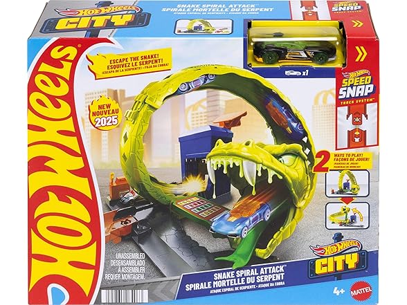 - Thrill seekers and racers 3 years old and up can find limitless adventures with the Hot Wheels Snake Spiral Attack playset