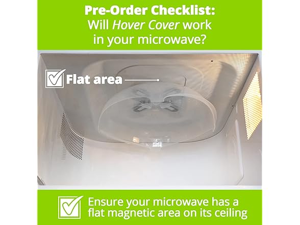 - FITS MOST MICROWAVES – PLEASE CHECK BEFORE ORDERING - Designed for most standard microwaves and works with microwave-safe plates and bowls. To avoid returns, watch our Pre-Order Compatibility Video and check inside your microwave for a flat metal ceiling where the HOVER COVER magnets can attach. Test compatibility by placing a magnet on the ceiling. Note: Compatibility is based on typical model features and may vary. Please verify your microwave’s interior before purchase to ensure a proper fit.