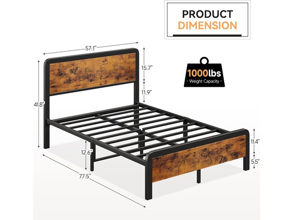 IDEALHOUSE Bed Frame with Vintage Wood Headboard, Platform Bed Frame with Safe Rounded Corners & Strong Metal Slats Support, Mattress Foundation/Noise-Free/No Box Spring Needed