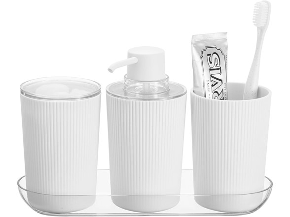 Minimal and modern in appearance, the iDesign Fluted 4-Piece Bathroom Accessories Set brings everyday functionality to any countertop or vanity. This 4-piece set-a matching soap pump, canister, toothbrush holder, and caddy tray - creates a cohesive aesthetic that marries function with statement-making style. The ribbed surface and silky-smooth finish take your bath to new heights and play nicely together for a clean, simple look that will coordinate your current furnishings. With iDesign, you can live simply every day.