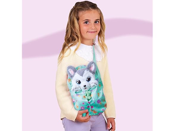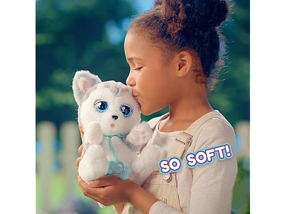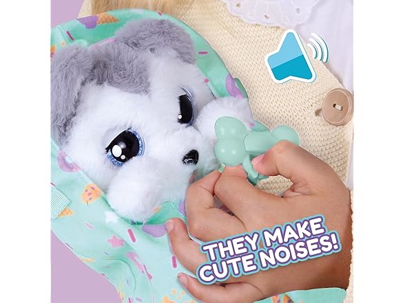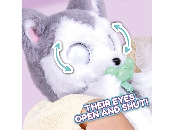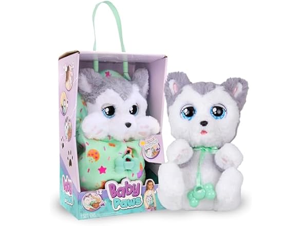 Baby Paws are the cutest puppies who love to be carried around with you wherever you go! Get to know the Husky, the foodie among all the Baby Paws! Take away his personalized pacifier and watch him open his eyes while he makes cute sounds. He is simply adorable! When you open his blanket you’ll discover his soft and fluffy plush body! It's time to go to sleep! Give him the pacificier and watch as his eyes close and he'll fall asleep while making puppy-like sounds. It includes a cute swaddle bag, so you can take your adorable puppy everywhere with you. The puppies are extremely cuddly, perfect to play or sleep with! The puppy comes with 2 accessories, his blanket & paci. Kids age 3 and up.