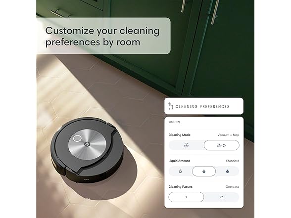 • CLEANS WHERE YOU WANT, WHEN YOU WANT - You can set specific cleaning preferences by room: For instance, set it to vacuum the living room, then vacuum and mop the kitchen. You can also choose how much liquid the mop should use by room.