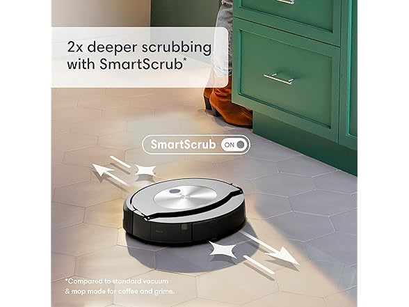 • SMART SCRUB MOPS BACK AND FORTH WITH CONSISTENT PRESSURE AND 2X DEEPER SCRUBBING. Some areas of the home need a deeper clean–pawprints in the mudroom, spills under the kitchen table, tiles in your bathroom. Simply enable SmartScrub and your Roomba Combo j7 plus will scrub back-and-forth, just like you would. *Compared to standard vacuum and mop mode for coffee and grime.