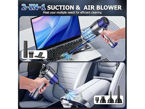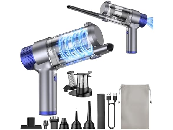 - đ§ăMULTIFUNCTIONAL VACUUM CLEANERăThis handheld vacuum cordless with 7 versatile accessories, transforms into a 4-in-1 cleaning tool: vacuuming, blowing, inflating, and vacuum compressing. Effortlessly switch between modes: the vacuum mode removes dust and debris from floors, carpets, and sofas; the blow mode clears hard-to-reach spots like keyboard crevices; the inflate mode quickly fills air mattresses and pool floats; and the vacuum seal mode compresses clothes, bedding, and storage bags to save space. From daily cleaning to home organization, it handles all scenarios with one device