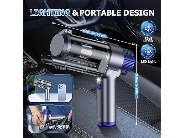 - â¨ăULTRA-PORTABLE CORDLESS VACUUM CLEANERăThis mini vacuum combines ultra-light design with a compact size, weighing only 1.19lbs and measuring 9.69 IN*2.91 IN* 8.11 IN. It easily fits into cabinets, car trunks, or travel bags. The ergonomic handle ensures comfort during use, while the built-in LED light illuminates hidden debris in dark corners. With an included storage bag for neat organization, making it perfect for car, home, or travel use