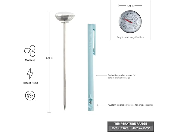 KitchenAid KQ919MW Analog Instant Read Food and Meat Thermometer with 1.75-inch Dial, Recalibration Feature, Mineral Water Storage Sleeve