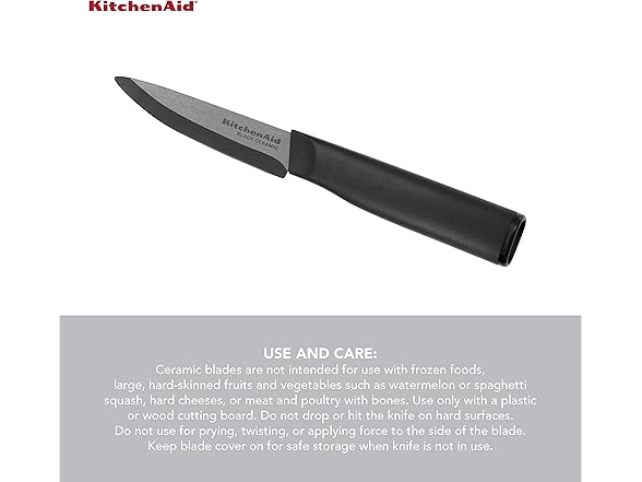 The KitchenAid® fine-edge paring knife is ideal for small everyday food prep needs, from cutting delicate fruit to slicing up a snack. These knives are expertly crafted from zirconia, a material second only to diamonds in hardness, and deliver a professional, quality cut every time. KitchenAid® Ceramic blades are designed to last, retaining sharpness longer than stainless steel, and will not rust, stain, or oxidize. Includes a custom-fit blade cover for secure, safe storage. KitchenAid® knives are top rack dishwasher safe. To extend the life of your cutlery, hand washing is recommended. Dry immediately. Ceramic Blades are not intended for use with frozen foods, large, hard-skinned fruits and vegetables such as watermelon or spaghetti squash, hard cheeses, or meat and poultry with bone. Use only with a plastic or wood cutting board. Do not drop or hit the knife on hard surfaces. Do not use for prying, twisting, or applying force to the side of the blade. Keep blade cover on for safe storage when knife is not in use.