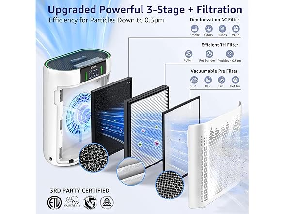 - Assurance: CARB/DOE/FCC/CA65/CE/RoHS certified and ETL listed(Available for California). Our HEPA air purifier for the bedroom does not produce trace amounts of ozone and is environmentally friendly. Please rest assured.