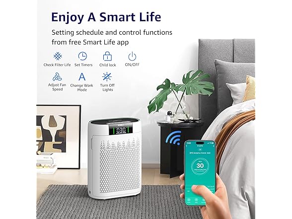 - App & Voice Control: Use the “Smart Life” app to turn your air purifier with a HEPA filter for your home into a remote, and manually control the settings for a burst of clean air. Monitor the air quality and check the filter life on this HEPA air purifier's display or APP at your leisure. Supports only 2.4GHz Wi-Fi networks