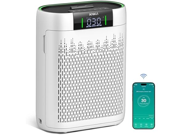 - Filter Replacement Reminder & Filter Life Display: The bedroom air purifier has a filter replacement reminder and viewing the remaining filter life function. When the filter reaches the end of its life, the filter replacement indicator will light up. The air purifier is easy to replace the filter system. We recommend replacing the filter every 3-6 months and using the official KNKA filter to ensure optimal performance. (Official replacement filters can be purchased on Amazon by searching B0D9GJRZGX)