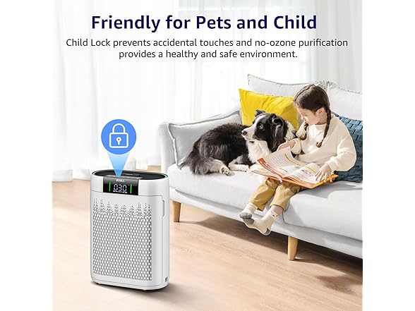 - 3 Timer & 5 Working Modes & Child Lock: The odor-eliminating air purifier for the home has 5 working modes (Sleep/Auto/1F/2F/3F). You can select the Fan Speed according to the air quality. When you don't know which fan speed to choose, you can turn on automatic mode, which can help you select the appropriate fan speed. You also can turn on the timer mode when you sleep or go out which is 2/5/8H. A child lock function to prevent babies or pets from accidentally touching the buttons