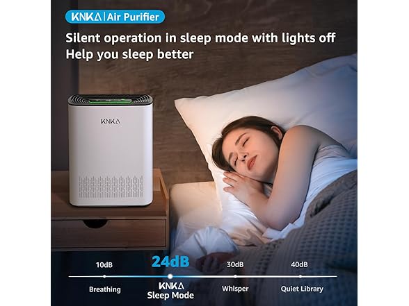 - Ultra-Quiet Sleep Mode: Operating at just 24dB—quieter than a whisper—it ensures restful sleep and uninterrupted air purification, a flexible light button to adjust the purifier's lights as needed, making it perfect for bedrooms or nurseries.