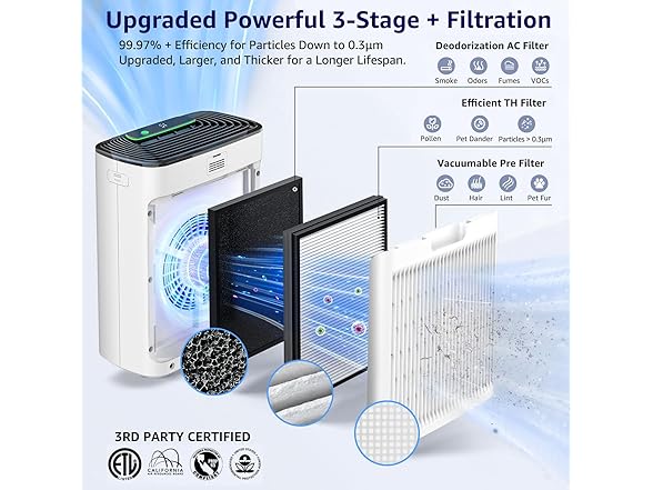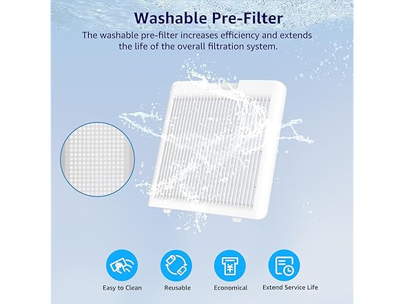 - Advanced Triple Filtration: The washable pre-filter extends the H13 HEPA filter's lifespan, reducing costs while capturing larger particles like hair and dust. The HEPA filtration system with an activated carbon layer removes 99.9% of particles as small as 0.3 microns, including dust, pollen, pet dander, and smoke, making it ideal for households with pets or allergy sufferers.