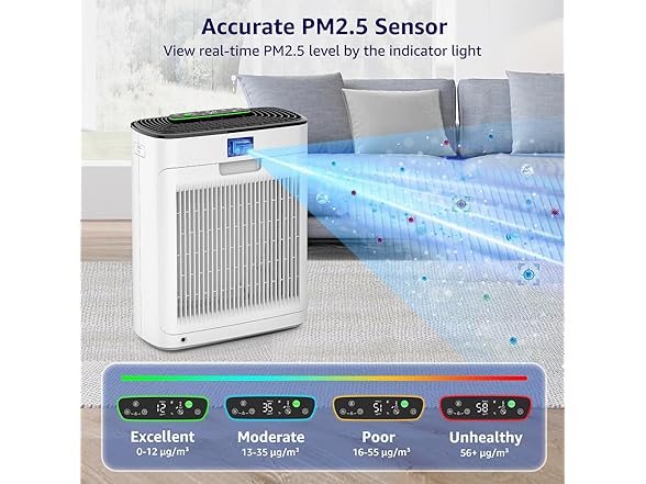 - Real-Time Air Quality Monitoring: A built-in sensor continuously tracks air quality, with real-time updates displayed via an LED indicator. In Auto Mode, the room air purifier adjusts fan speed automatically for optimal performance and energy efficiency.