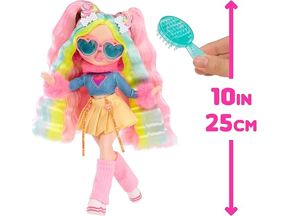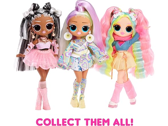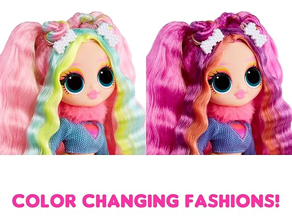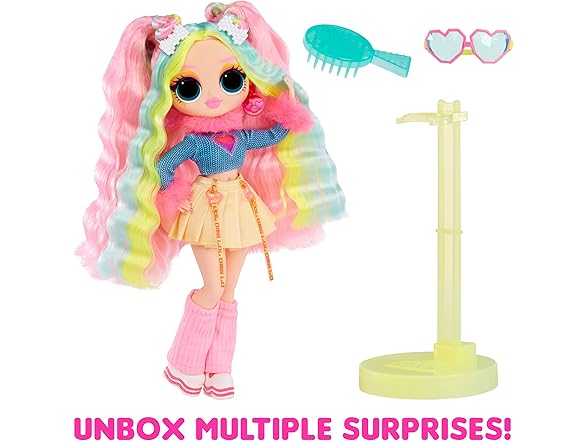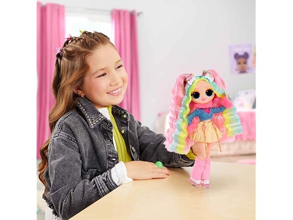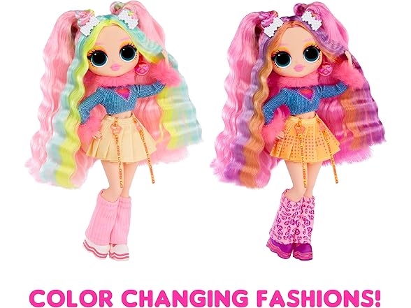 Introducing LOL Surprise O.M.G. Sunshine Color Change fashion doll Bubblegum DJ! When it comes to colors, Bubblegum DJ knows how to bring them on! She loves to mix up her fashions just like she mixes up her music to make life more colorful! Unbox multiple surprises with Bubblegum DJ including color changing fashions and stylish accessories. Bring Bubblegum DJ outside during any time of day whether it’s sunny or cloudy, or even indoors next to a window, for a glamorous makeover. Watch the magic happen before your eyes and see her hair color change from teal to purple. Can you guess what her yellow and light pink highlights will color change to? Don’t forget to check out the color change surprises on her fierce fashions that gradually reveal once outside. When exposed to light, Bubblegum DJ’s trendy leg warmers have happy faces that become purple, cute pink prints patterning her skirt, and her chic shoes dramatically change from white to purple. You can repeat the color changes as many times as you’d like! Head back indoors to return Bubblegum DJ to her original look and go back outside or by a window to experience her gorgeous transformations again. This Sunshine Color Change doll has stunning features, beautiful hair, and is articulated with tons of poses. Pro Tip: Hands are removable for easy dressing. Collect all 3 LOL Surprise OMG Sunshine Makeover™ fashion dolls: Bubblegum DJ, Sunrise, and Switches. L.O.L. Surprise fashion dolls with stylish hair, outfits and many detailed accessory pieces make a perfect toy for kids, including 4 years old and up for imaginative pretend play! As gifts for any special occasion, dolls provide hours of social play with siblings and friends! From MGA Entertainment, creators of L.O.L. Surprise fashion and collectible dolls, Rainbow High™ fashion dolls, Na Na Na Surprise dolls, Bratz® fashion dolls, MGA's Dream Ella™, MGA's Glitter Babyz™, Lalaloopsy™, Baby Born® Surprise baby dolls and collectibles, Little Tikes® kids toys and many other favorite brands.