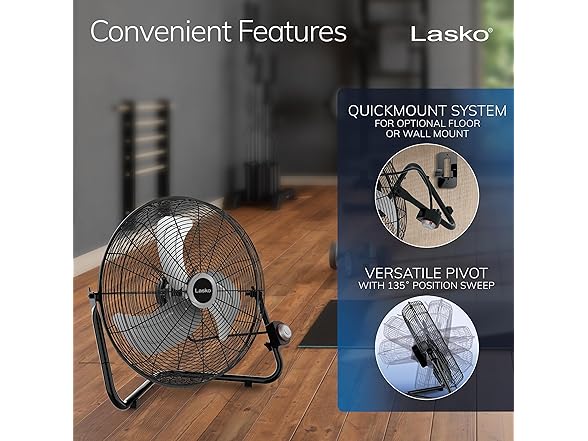 Introducing the versatile Lasko High Velocity Wall Mount Fan with Pivoting Head, designed for cooling and convenience indoors. This all-in-one solution functions both as a floor fan and a wall-mounted fan, perfect for any room setting, especially as cooling fans for bedroom and stand up fan options. Easily transform your fan from a heavy duty floor setup to an efficient wall mounted fan with the included wall bracket, providing adaptable cooling solutions for your home. Experience powerful air circulation with the three-speed settings, ensuring your space stays cool and comfortable. Crafted with durability in mind, this electric fan features a strong tubular steel structure and metal fan blades, long lasting use. The floor fan allows for directed airflow, making it an ideal choice for large rooms or as a bedroom fan. The black fan design with an all-metal construction that suits environments like garages or attics while maintaining a sleek aesthetic at home. Customization is made simple with the pivoting head, enabling precise airflow direction to meet your cooling needs. The floor fan for indoors stays in place with built-in rubber pads, which helps in reducing vibrations. Safety is prioritized with Lasko’s ETL listing and The Blue Plug safety fuse technology, automatically stopping the fan during potential electrical faults. Enjoy the flexibility of a standing fan for room setups or the convenience of floor fans for home use. With user-friendly, no-tools assembly, this Lasko high velocity fan is ready to deliver cooling efficiency, whether you choose it as a pedestal or wall fan option.
