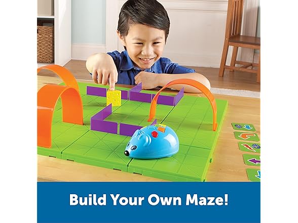 Build your maze, and then use the coding cards to create a step-by-step path for the Programmable Robot Mouse. Program the sequence of steps, and then watch the mouse race to find the cheese! This deluxe STEM set provides the perfect hands-on introduction to coding concepts for children ages 5+. The colorful components make it easy for kids to design mazes, plan routes, and program their mouse to navigate through obstacles to reach the cheese—learning fundamental coding skills through play without screens or apps. Children love watching their programming come to life as the mouse follows their commands, building critical thinking and problem-solving skills with every maze they complete. The color-coded buttons make programming intuitive, with forward, backward, left, right, and action functions that can be programmed up to 40 steps in sequence. Parents and teachers appreciate how the set grows with children's abilities—starting with simple paths and advancing to complex mazes that require sophisticated programming solutions. The activity cards provide structured challenges, while the customizable maze components allow for endless creative possibilities.Mouse measures 4"L and requires 3 AAA batteries (not included). Features two speeds for added programming challenges.