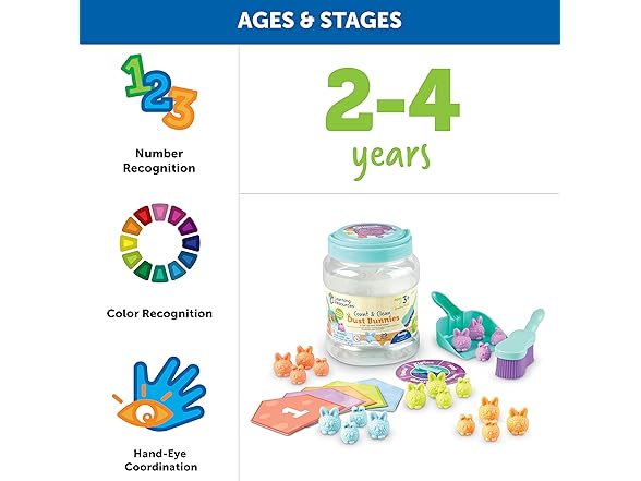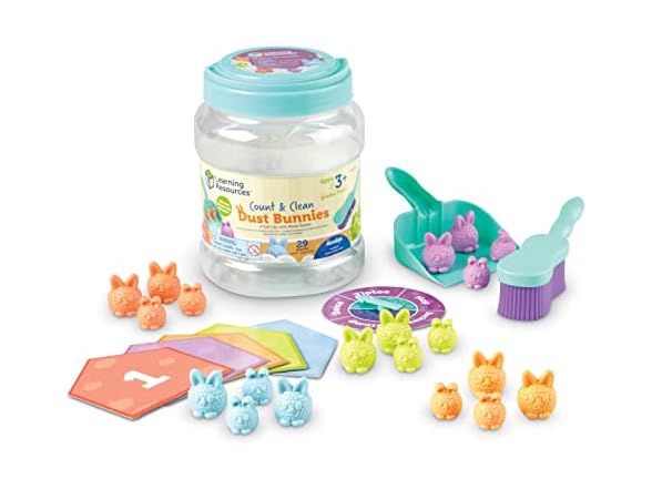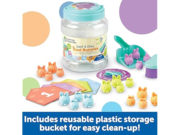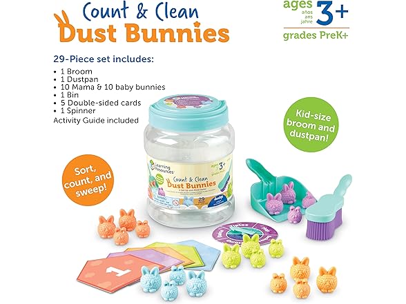 - DURABLE EDUCATIONAL SET - Features 20 colorful dust bunnies in 2 sizes, kid-sized broom and dustpan, all stored in convenient plastic container