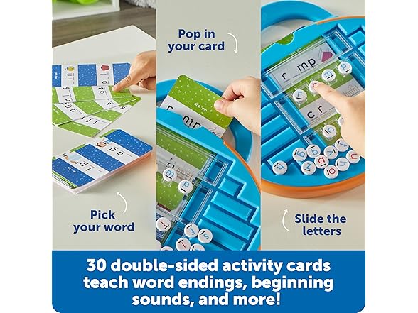 - What Do Kids Learn?: This set's 20 double-sided activity cards challenge kids to fill in missing sounds, spell simple words, and more—plus, they store on the front!