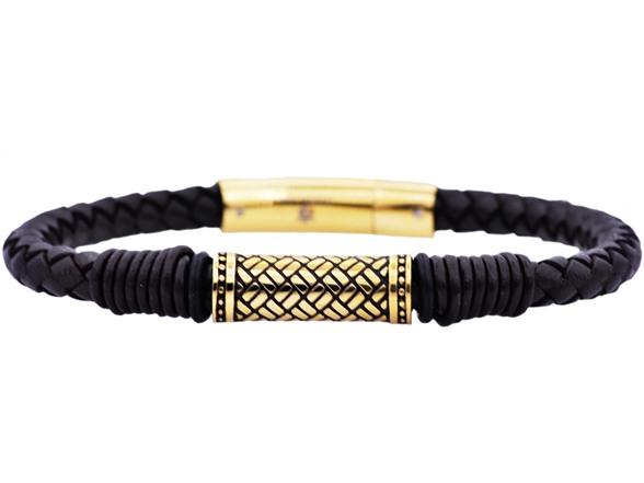 Blackjack Mens Black Leather Gold Stainless Steel Bracelet