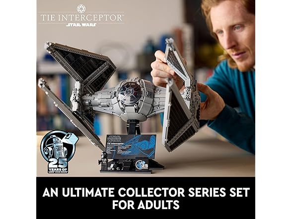 Spark memories of classic Star Wars saga action with this LEGO Star Wars Ultimate Collector Series TIE Interceptor model (75382) for adults. The iconic TIE Interceptor starfighter was part of the first ever launch of LEGO Star Wars UCS sets in the year 2000; now it’s back and redesigned for even greater authenticity. Revel in buildable details, such as its distinctive wings, cockpit interior, laser cannons and rear engine. This collectible brick built vehicle measures over 16 in. (40 cm) long and has a display stand with an information plaque, a LEGO Star Wars 25th anniversary brick and space for the included LEGO TIE Pilot minifigure and LEGO mouse droid figure. This creative build and display model is part of a series of LEGO Star Wars collectible sets (sold separately) that offer relaxing activities for adults. It comes with step-by-step instructions, and you can also check out the LEGO Builder app for zoom and rotate viewing tools to assist you with the complex, immersive and rewarding build. Contains 1,931 pieces.