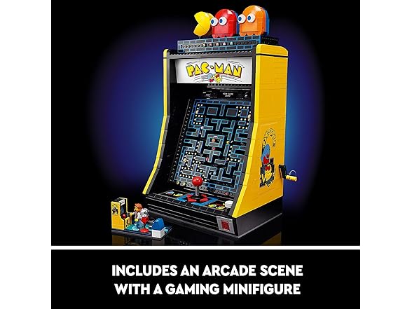 - What’s in the box? – Includes all you need to build the PAC-MAN Arcade cabinet and a display case with rotatable PAC-MAN, BLINKY and CLYDE figures, plus a 1980s arcade scene with a gaming minifigure