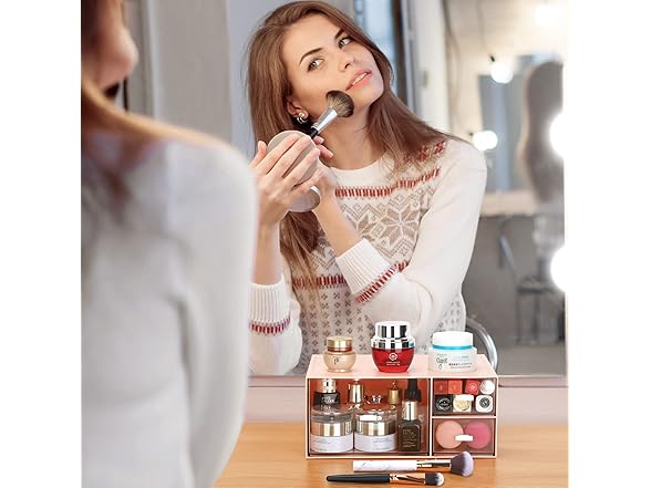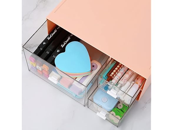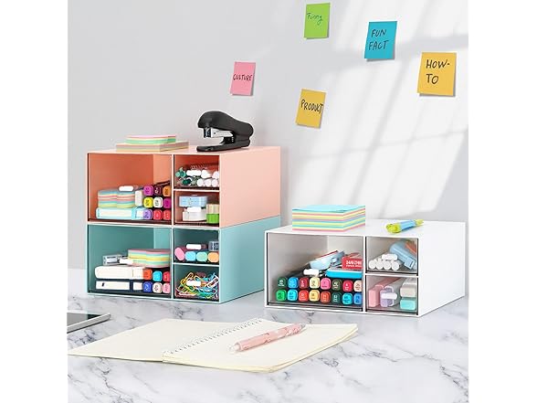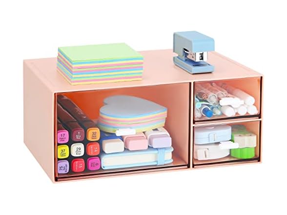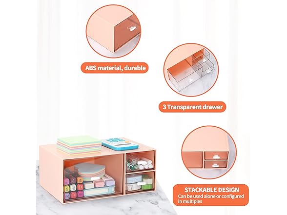 - MODULAR STORAGE - This Desktop storage with 3 drawers is perfect for vanities, dressers, bathroom, craft room, office, dorm and more. Not only perfect for storing your makeup brushes, nail polishes, Liquid Foundation, lipsticks and other small personal items but also great for storing your desktop stationery such as paper clips, pencil, scissors, binder clips and many other office supplies; you can put any other daily necessities on the Desktop storage.