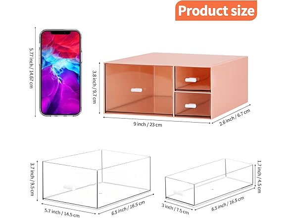 - PERFECT SIZE and PRACTICAL - Size 9*2.6*3.8inch/23*6.7*9.7cm, it fits easily in the desk. This Desktop Storage Box has 3 drawers to provide enough space to store your daily essentials for easy access.