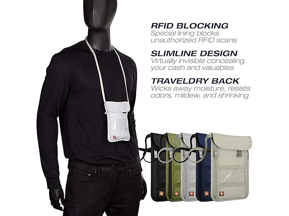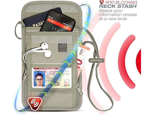 As part of Lewis N. Clark’s RFID-blocking collection, this neck wallet takes keeping your information private to a new level. Special lining blocks unauthorized RFID scans, and the ultra-lightweight rip-stop nylon exterior makes for a strong yet low-profile security wallet, ensuring that your valuables stay hidden. The back is padded with a special TravelDry fabric that quickly moves moisture away from the skin and dries fast, making it resistant to odors and shrinking. Whether you’re in a hot crowded subway, or spending all day at a summer festival, this hand washable material keeps you and your belongings from getting sweaty and sticky. Featuring four individual compartments that include a mesh pocket and an ID window, you can store your credit cards, passport, electronics such as smartphones and music players, currency, receipts, and other valuables in this neck stash. It’s closed securely with a hook and loop fastener and the fully adjustable lanyard can be customized to fit your specific needs. You can be rest-assured that you will be safe from electronic pickpocketing and identity theft with this time-tested design.