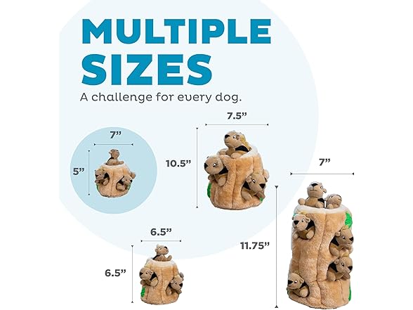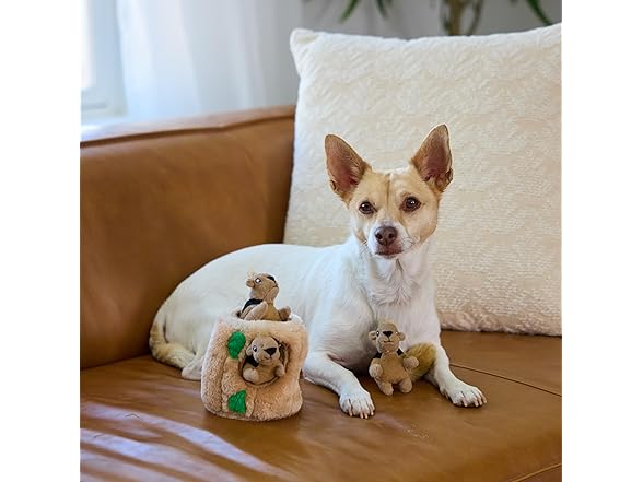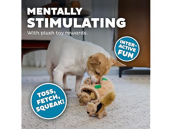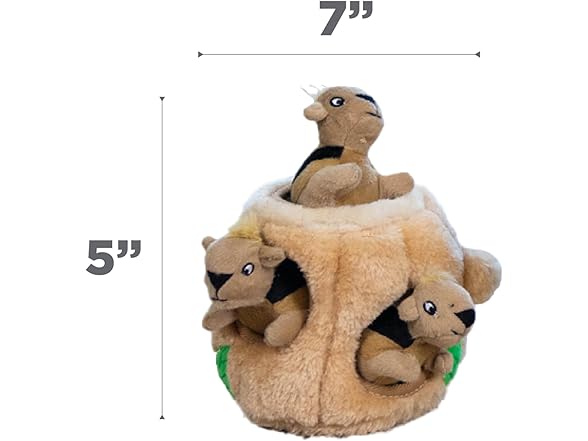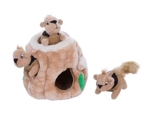 - 3 Squeaky Squirrels: Small tree trunk (4.5" x 4.7" x 4.7") holds three squeaky squirrels for pups to find and tug out