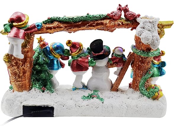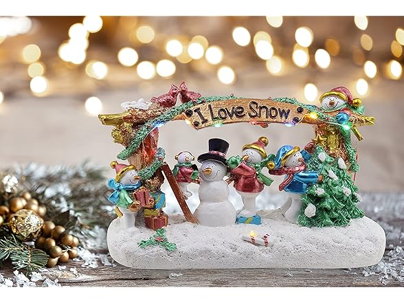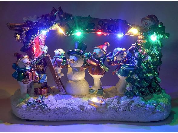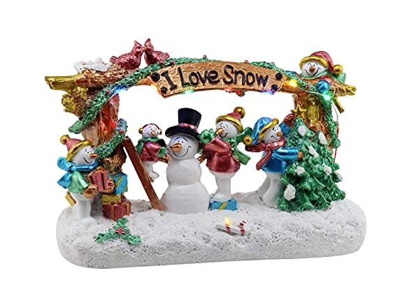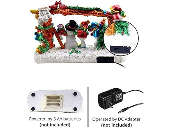 - SPECIFICATIONS – Create a warm and cozy ambiance with this elegant Christmas Snowmen Decoration. The glowing lights highlight a gathering of happy snowmen enjoying the snowy weather. This Snow Village is operated with 3 x AA Battery (Not Included) and has a DC Jack Input. You can place it anywhere you want, and design your own Christmas Village Display Indoor or Outdoor! Product size: 8.9 x 3.9 x 5.5 In.