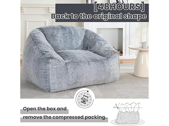 - No Assembly: Compressed in a package for easy storage or moving , this bean bag chair requires zero assembly. Simply unbox, let it stand for 48 hours to fully recover its plush shape, and iron minor wrinkles for a polished look. It is the ultimate comfy chair for bedrooms, living rooms, dorms, and beyond.